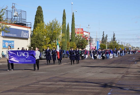 La UACJ Campus Nuevo Casas Grandes presentó un nutrido contingente de estudiantes y deportistas dentro del Desfile Conmemorativo por el Aniversario 115 de la Revolución Mexicana, celebrado la mañana del 20 de noviembre por las principales avenidas del centro de Nuevo Casas Grandes.