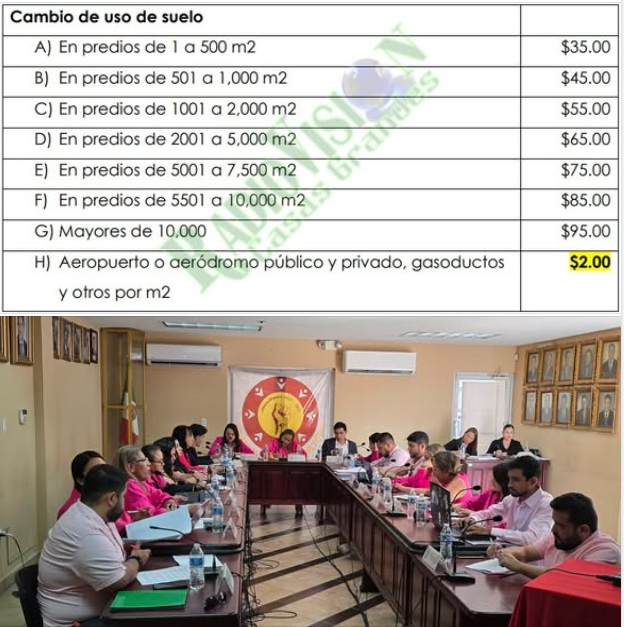 Sin embargo este mismo grupo de regidores aprobó el cambio del precio de uso de suelo en la ley de ingresos para el 2026, actualmente el valor catastral de dicho predio es de 20 pesos y los regidores buscando a toda vista beneficiar este grupo de empresarios modificaron el precio uso de suelo del terreno donde se construirá el aeropuerto a un valor catastral de 2 pesos, por lo que actualmente se cobraría alrededor de 30 millones de pesos con la modificación para entre alrededor de 3 millones de pesos.