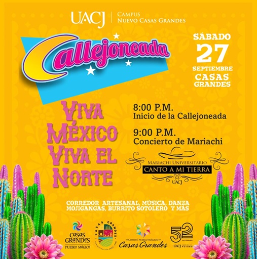 La UACJ invita a la Callejoneada ¡Viva México! ¡Viva el norte! la cual se llevará a cabo el sábado 27 de septiembre en el centro histórico de Casas Grandes Pueblo Mágico, entre la Presidencia Municipal y la plaza José Inés Salazar.