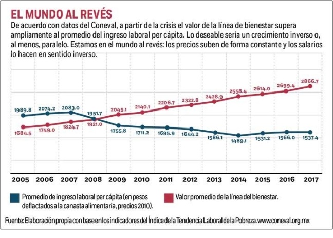 Por su parte, la medición que hace el Coneval respecto del ingreso laboral real per cápita, muestra una caída constante, al menos desde el año 2005. Pues el promedio en esa fecha fue de 1,988 pesos mensuales, como ingreso laboral real; alcanzó su máximo histórico en 2007 con 2,083 pesos al mes, y a partir de esa fecha se registró una caída permanente hasta llegar a su mínimo histórico en 2014, cuando se ubicó en 1,489.1 pesos al mes por trabajador; e iniciándose una lenta recuperación para llegar a los 1,537.4 pesos mensuales en 2017. De esta forma, si se compara el año 2017 con 2007 resulta que el ingreso laboral per cápita ha tenido una pérdida de 26% de su valor real.