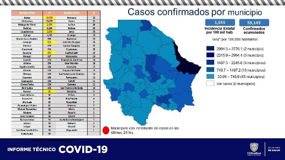 La capital encabeza la lista con 463 casos, seguida de Parral con 132, Ciudad Juárez 121, Cuauhtémoc 114, Nuevo Casas Grandes 47, Delicias 39, Ojinaga 26 y Camargo 23.