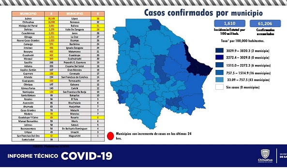 Casos acumulados por municipio: 30 mil 149 Juárez, 16 mil 590 Chihuahua, dos mil 631 Hidalgo del Parral, dos mil 279 Delicias, dos mil 251 Cuauhtémoc, mil 211 Ojinaga, mil 023 Nuevo Casas Grandes, 574 Camargo, 456 Jiménez, 402 Guachochi, 402 Bocoyna, 349 Meoqui, 248 Saucillo, 203 Aldama, 167 Aquiles Serdán, 158 Guerrero, 155 Allende, 147 Chínipas, 152 Guazapares, 140 Gómez Farías, 120 Namiquipa, 96 Rosales, 99 Santa Bárbara, 86 Ascensión, 84 Ahumada.