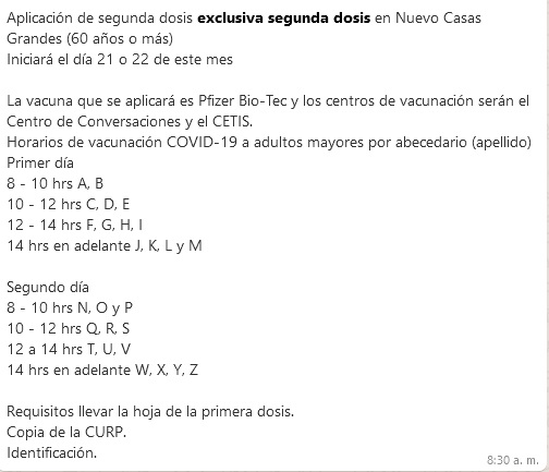 Confirma Mario Saldaña, Delegado Regional de Gobierno Federal que este próximo miércoles y jueves 21 y 22 del mes en curso será la vacunación COVID-19 se aplicara la segunda dosis a adultos mayores de 60 años en Nuevo Casas Grandes y Casas Grandes.