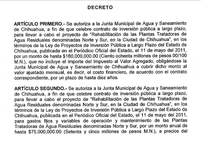 El gobernador Javier Corral Jurado presentó una iniciativa ante el Congreso del Estado para buscar una autorización de crédito a largo plazo por cerca de 950 millones de pesos para un proyecto de Rehabilitación de las Plantas Tratadoras de Agua Residuales denominadas Norte y Sur en la ciudad de Chihuahua.