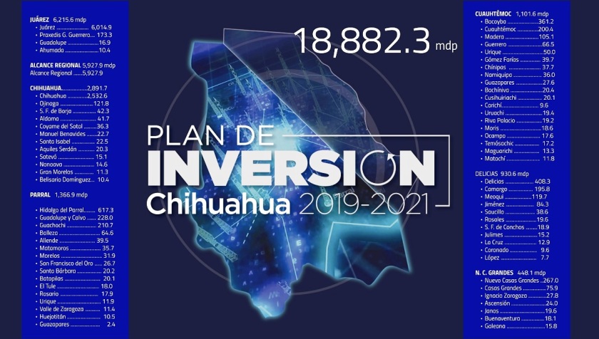 El Gobernador, Javier Corral Jurado, presentó el pasado jueves el Plan de Inversión 2019-2021 que contempla las obras que habrán de desarrollarse en toda la entidad en los próximos dos años.