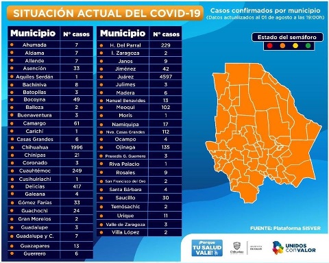 Los municipios de Julimes, Guadalupe, Buenaventura, Temósachi, Galeana, Santa Bárbara, Ignacio Zaragoza, López, San Francisco del Oro, Coronado, Valle de Zaragoza, Moris, Praxedis G. Guerrero, Ocampo, Balleza, Cusihuiriachi, Gran Morelos, Aquiles Serdán, Batopilas y Carichi, registran entre 1 y 4 casos.