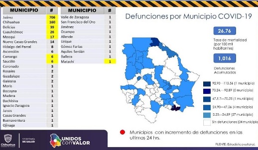 Casos por municipios: Ahumada 7, Aldama 11, Allende 7, Ascensión 39, Aquiles Serdán 1, Bachíniva 8, Batopilas 3, Bocoyna 59, Balleza 2, Buenaventura 4, Camargo 68, Carichí 2, Casas Grandes 6, Chihuahua 2,310, Chínipas 22, Coronado 3, Cuauhtémoc 329, Cusihuiriachi 1, Delicias 507, Galeana 4, Gómez Farías 37, Guachochi 27, Gran Morelos 3, Guadalupe 3, Guadalupe y Calvo 7, Guazapares 13, Guerrero 8 e Hidalgo Del Parral 259.