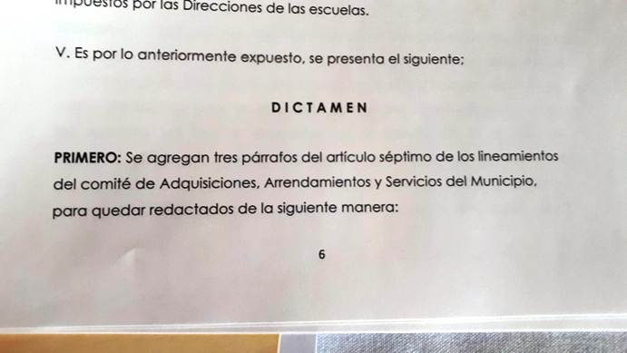 Durante sesión de cabildo el regidor José Luis Arroyos dio lectura al dictamen sobre la propuesta que hizo hace varios meses atrás la regidora Olivia Cantu, lo que la regidora propuso al H. Ayuntamiento es que proveedores inscritos al padrón municipal otorgaran el 5 por ciento del valor de la obra que realicen o servicio que presten a Presidencia Municipal y que este recurso sea destinado a Escuelas Públicas.