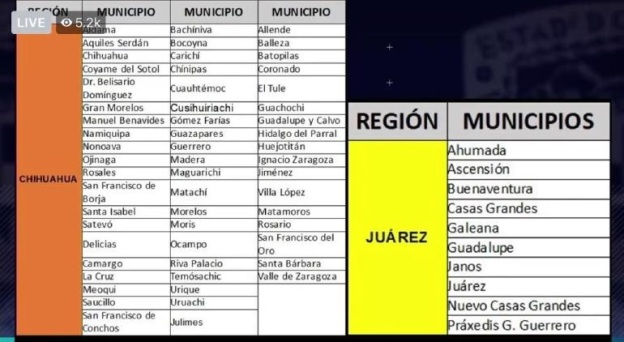 El Gobernador Javier Corral indicó que la región norte de Ciudad Juárez y 9 municipios pasará a color amarillo mientras la ciudad capital de Chihuahua y los otros 56 municipios de la región centro-sur permanecerán en naranja.