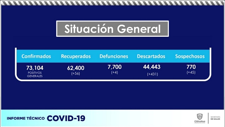 Con ello desde que inició la pandemia en la entidad se han acumulado un total de 73 mil 104 contagios y 7 mil 700 decesos.