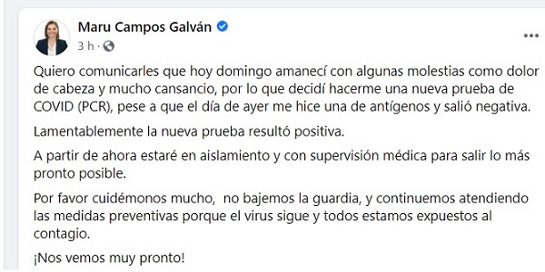 La gobernadora electa María Eugenia Campos, resultó positiva al Covid-19 luego de que se realizara una nueva prueba para detectar la enfermedad, así lo informé en su cuenta de Facebook.