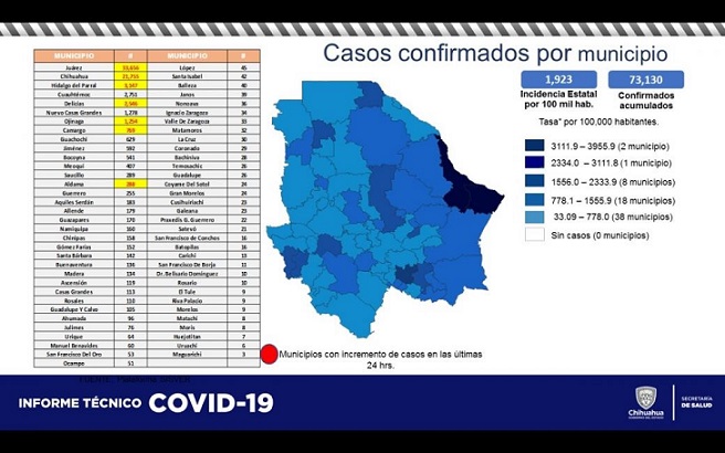 Por municipios los contagios se distribuyen en 33 mil 656 en Ciudad Juárez, 21 mil 755 Chihuahua, 3 mil 147 Parral, 2 mil 751 Cuauhtémoc, 2 mil 546 Delicias, 1 mil 278 Nuevo Casas Grandes, 1 mil 254 Ojinaga, 769 Camargo, 629 Guachochi, 592 Jiménez, 541 Bocoyna, 407 Meoqui, 289 Saucillo, 288 Aldama, 255 Guerrero, 183 Aquiles Serdán, 179 Allende, 169 Guazapares, 158 Chínipas, 160 Namiquipa, 152 Gómez Farías, 142 Santa Bárbara, 134 Madera, 136 Buenaventura, 121 Ascensión, 113 Casas Grandes, 110 Rosales, 105 Guadalupe y Calvo, 96 Ahumada, 76 Julimes, 64 Urique, 60 Manuel Benavides, 53 San Francisco del Oro, 45 López, 51 Ocampo, 42 Santa Isabel, 40 Balleza, 39 Janos, 36 Nonoava, 34 Ignacio Zaragoza, 33 Valle de Zaragoza, 30 La Cruz, 32 Matamoros, 28 Bachíniva, 26 Temósachic, 26 Guadalupe, 29 Coronado, 24 Gran Morelos, 24 Coyame del Sotol, 23 Cusihuiriachi, 22 Praxedis G. Guerrero, 23 Galeana, 21 Satevó, 16 San Francisco de Conchos, 16 Batopilas, 13 Carichí, 11 San Francisco de Borja, 10 Belisario Domínguez, 10 Rosario, 9 El Tule, 9 Riva Palacio, 8 Moris, 8 Matachí, 7 Huejotitán, 9 Morelos, 5 Uruachi y 3 Maguarichi.