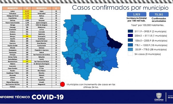 El último reporte de la Secretaría de Salud arroja el contagio de 31 personas y 2 fallecimientos en la entidad por COVID-19, los cuales ocurrieron en el municipio de Juárez.