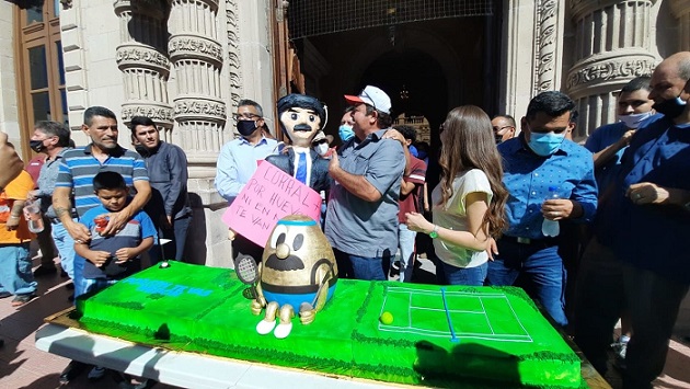 Festejando el final de la administración de Corral Jurado, los transportistas llevaron un pastel en forma de cancha de tenis y con un huevo dorado con bigotes; asemejándo al mandatario de Chihuahua jugando este deporte.