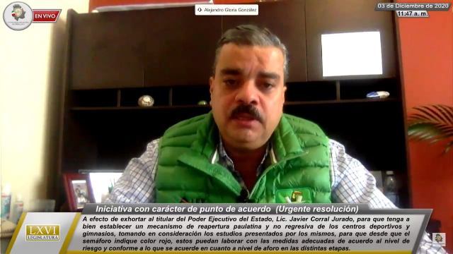 Diputados y diputadas de la Sexagésima Sexta Legislatura del Congreso de Chihuahua, exhortaron al titular del Ejecutivo Estatal, para que tenga a bien establecer un mecanismo de reapertura paulatina y no regresiva de centros deportivos y gimnasios; ello, tras la iniciativa presentada por el diputado del PVEM, Alejandro Gloria González.
