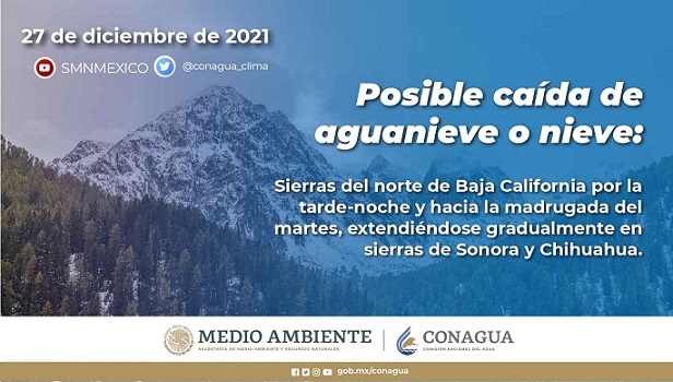 Asimismo, se pronostica caída de aguanieve o nieve en las sierras del norte de Baja California, condición que se extenderá hasta la madrugada del martes hacia las montañas de Chihuahua y Sonora. También se prevé ambiente de frío a muy frío durante las primeras horas de mañana, con heladas al amanecer en las montañas del noroeste, norte, occidente y centro del país.