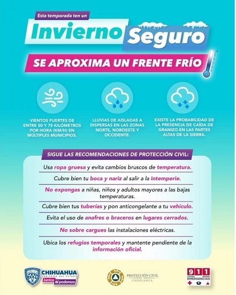 La Coordinación Estatal de Protección Civil (CEPC) emitió un aviso preventivo a la población, ante el paso del Frente Frío 17 y 18 que mantendrá probabilidades de lluvias, aguanieve y nieve en algunas zonas del estado, además de fuertes rachas de viento.