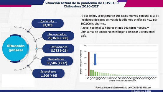 Además se reporta una tasa de incidencia de casos activos de los últimos 14 días de 40.2 por 100 mil habitantes y a nivel nacional se han registrado 943 casos nuevos, de modo que Chihuahua se posiciona en el lugar 4 de casos activos en el país.