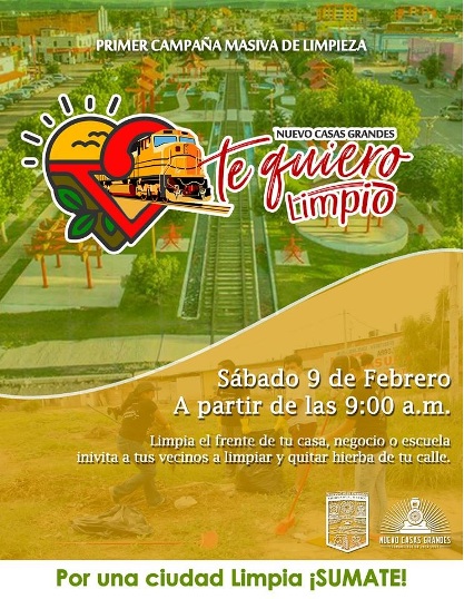 En rueda de prensa conjunta con el Secretario del Ayuntamiento Javier Mendoza, y el Oficial Mayor Víctor Quiñones, así como la titular de la Dirección de Comunicación Social, Silvia Orozco, este jueves fue anunciada la campaña masiva de limpieza “Nuevo Casas Grandes Te quiero…limpio”, la cual se llevará a cabo este próximo 9 de febrero en diversos puntos de la ciudad.