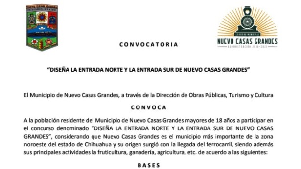 El Gobierno Municipal a través de las direcciones de Obras Públicas, Cultura y Turismo, emitió este viernes 3 de diciembre la convocatoria “Diseña la Entrada Norte y Sur de Nuevo Casas Grandes”, por medio de la cual se invita a la ciudadanía para que participe en la elaboración de un diseño y tener la posibilidad de ganar 10 mil pesos en efectivo, un reconocimiento y una placa con el nombre del ganador en la obra que se va a construir con este propósito.