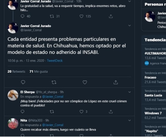 El gobernador Javier Corral informó en su cuenta de twitter, que el gobierno de Chihuahua no se adherirá al INSABI (Instituto de Salud para el Bienestar).