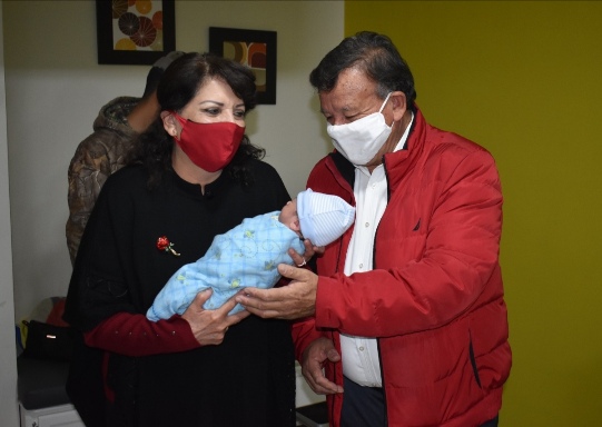 Por tercer año consecutivo, el Alcalde Héctor Mario Galaz y la Presidenta del DIF Municipal Rosa María García de Galaz, a nombre de la Administración Municipal, hicieron entrega de obsequios a los padres del primer bebé del año 2021.