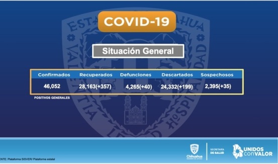 En el lapso de las últimas 24 horas, el estado de Chihuahua llegó a los 46 mil 052 casos confirmados de COVID-19 y suma 4 mil 265 defunciones, de acuerdo con el reporte emitido por la Secretaría de Salud.