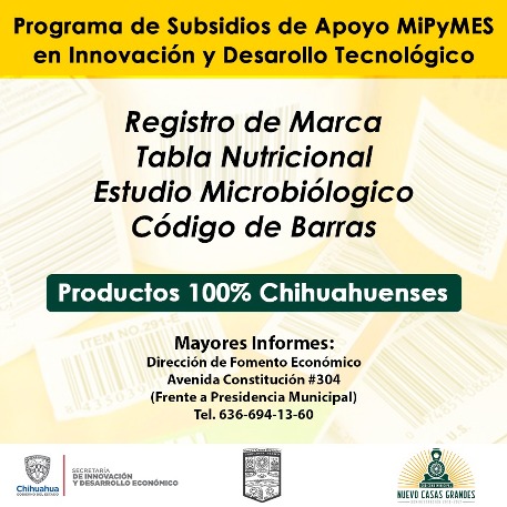 El Gobierno Municipal de Nuevo Casas Grandes a través de la Dirección de Fomento Económico, convoca a micro, pequeños y medianos empresarios de esta ciudad que deseen hacer crecer su negocio y comercializar más sus productos, a conocer detalles sobre los requisitos para obtener un subsidio en trámites de Registro de Marca, Código de Barras, Estudio Microbiológico y Tabla Nutrimental.