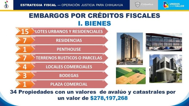 Embargos mediante créditos fiscales por un monto de 583.5 millones de pesos (mdp) en bienes muebles e inmuebles, además de marcas comerciales y acciones en empresas, son el resultado de la estrategia fiscal de la Operación Justicia para Chihuahua, a través de la Secretaría de Hacienda de Gobierno del Estado.