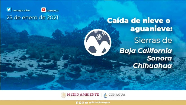 Durante la mañana de este martes, continuará el ambiente gélido sobre el noroeste y norte del país, la probabilidad para caída de aguanieve o nieve en montañas de Baja California, Chihuahua y Sonora, además de temperaturas mínimas de -15 a -10 grados Celsius con heladas en cimas de Chihuahua, Durango y Sonora; de -10 a -5.