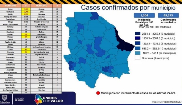 En cuanto a casos acumulados por municipio: Ahumada 76, Aldama 145, Allende 82, Ascensión 66, Aquiles Serdán 160, Bachíniva 16, Batopilas 6, Bocoyna 316, Balleza 15, Buenaventura 37, Camargo 336, Carichí 8, Casas Grandes 33, Chihuahua 11,798, Chínipas 129, Coronado 11, Coyame del Sotol 8, Cuauhtémoc 1,515, Cusihuiriachi 15, Delicias 1,831, Dr. Belisario Domínguez 3, Galeana 7, Gómez Farías 68, Guachochi 295, Gran Morelos 16, Guadalupe 19, Guadalupe y Calvo 37, Guazapares 72 y Guerrero 74.