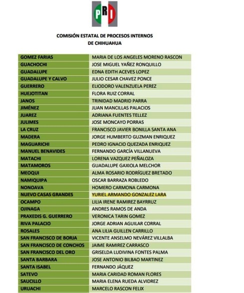 Después de llevar a cabo un proceso interno el PRI emite dictamen. En lo que corresponde a Nuevo Casas Grandes como candidato a la alcaldía queda Yuriel Armando González Lara, con quien se sostuvo una entrevista telefónica expreso sentirse contento con el dictamen del partido en mano además renovado y listo para la próxima contienda electoral, menciono que como candidata a sindico quedo Perla Hinojos.