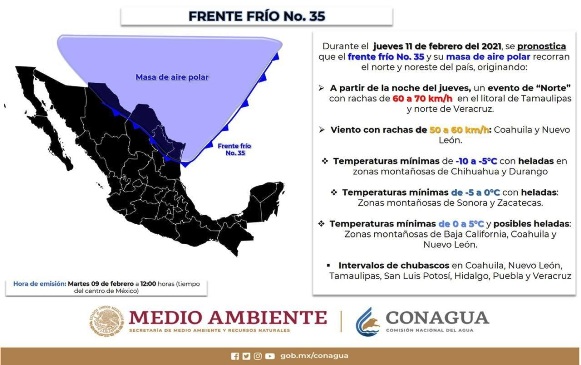 De acuerdo al Sistema Meteorológico Nacional, este jueves 11 ingresará el frente frío número 35 por el noroeste de la entidad, y en interacción con la corriente en chorro y una vaguada superior, ocasionará el desplome de las temperaturas a partir del sábado 13.