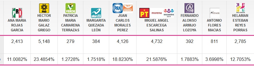 A las 10:50 de la mañana del día de hoy se tenían contabilizadas 83 de 92 actas con un total de 5, 148 votos para Héctor Mario, un segundo lugar Miguel Ángel Escárcega de PT,MORENA con 4,732 votos y el tercer lugar para Juan Carlos Morales del PAN con 4,126 votos.