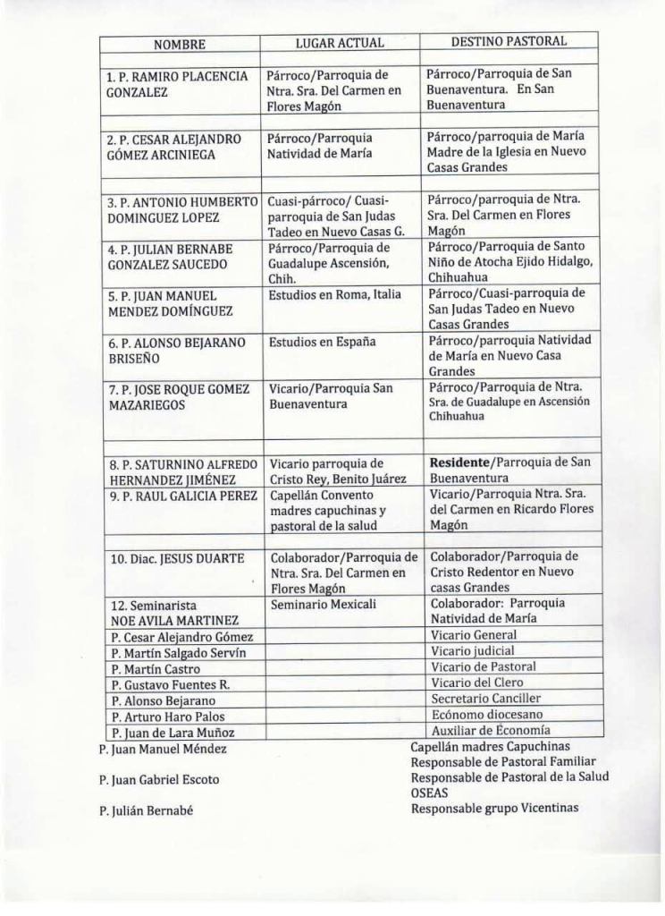 Por medio de un comunicado Diócesis de Nuevo Casas Grandes da a conocer los cambios de sacerdotes en parroquias que se estarán realizando próximamente, textualmente algunos puntos del comunicado.