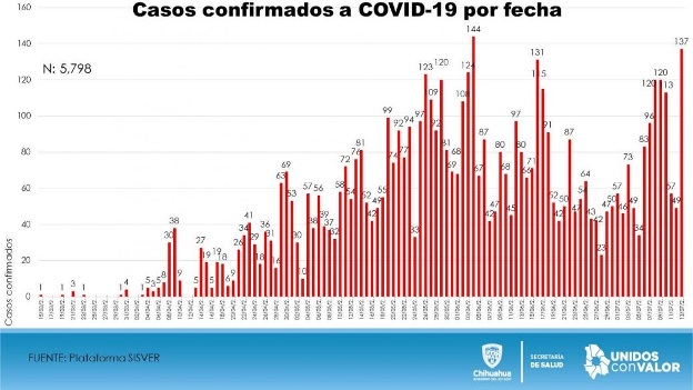 El director médico de la Secretaría de Salud en la Zona Norte, Arturo Valenzuela Zorrilla dio a conocer que se confirmaron 137 nuevos registros y se actualizaron 52 más, con lo que el total general de casos por COVID-19 llegó a 5 mil 798 y sumaron 17 nuevas defunciones para alcanzar 759 en el estado.