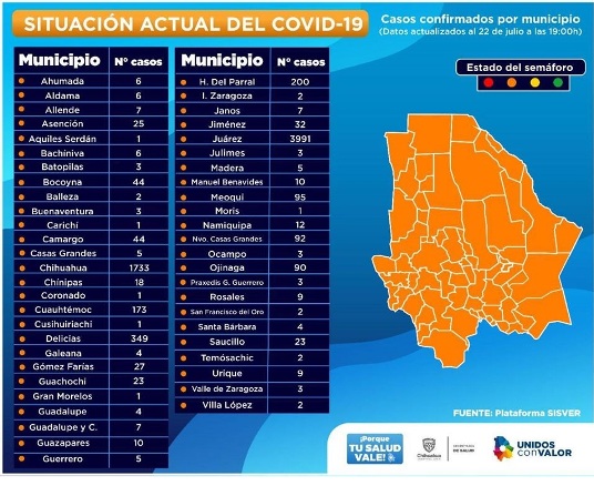 3, Camargo 44, Casas Grandes 5, Chihuahua mil 733, Chínipas 18, Coronado 1, Cuauhtémoc 173, Cusihuiriachi 1, Delicias 349, Galeana 4, Gómez Farías 27, Guachochi 23, Gran Morelos 1, Guadalupe 4, Guadalupe y Calvo 7, Guazapares 9, Guerrero 5, Hidalgo del Parral 200, Ignacio Zaragoza 2, Janos 7, Jiménez 32, Juárez 3 mil 991, Julimes 3, López 2, Madera 5, Manuel Benavides 10, Meoqui 95, Moris 1, Namiquipa 12, Nuevo Casas Grandes 92, Ocampo 3, Ojinaga 90, Praxedis G. Guerrero 3, Rosales 9, San Francisco del Oro 2, Santa Bárbara 4, Saucillo 23, Temósachic 2, Urique 9 y Valle de Zaragoza 3.