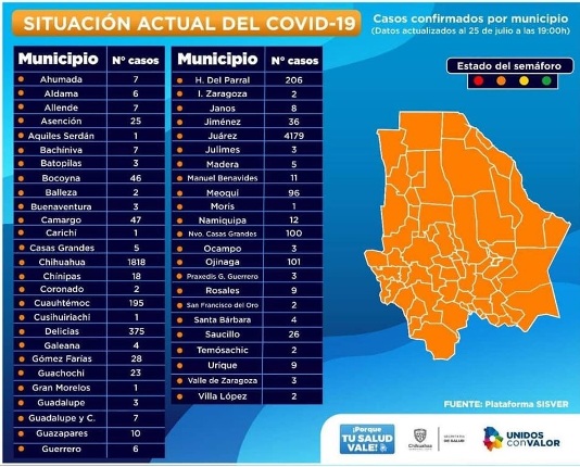 Del total de casos positivos confirmados, 4 mil 179 (+26) pertenecen a Ciudad Juárez, 1,818 (+17) a la ciudad de Chihuahua, 375 en Delicias, 206 a Parral, 195 a Ciudad Cuauhtémoc, hay 101 en Ojinaga, 100 en Nuevo Casas Grandes y 96 en Meoqui.