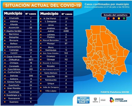 De los 7 mil 707 casos positivos en el estado, 4 mil 288 están en Ciudad Juárez, otros 1 mil 877 en la ciudad de Chihuahua, y resaltó Delicias con 395: “sigue en ascenso, y es un incremento importante”.