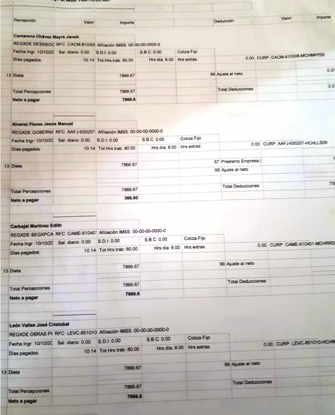 Aquí la nómina de la decena próximo pasada donde regidores perciben de dieta $ 7,888.6 sumando al mes son 23 mil 659 pesos, están por finalizar las campañas no solicitaron licencia trabajaron para la campaña y para el municipio.