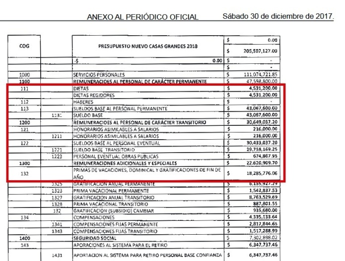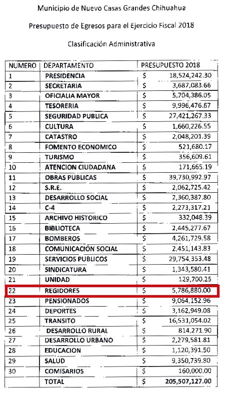 Para el municipio de Nuevo Casas Grandes el presupuesto de egresos fue de 205 millones 507 mil 127 pesos de los cuales más de 180 millones de pesos se va en sueldos, bajarse sueldos a funcionarios y regidores fue la propuesta del regidor perredista a inicios del año y fueron los panistas quienes no lo aprobaron, cabe resaltar que el presupuesto de egresos viene estipulado para los regidores 5 millones 786 mil 880 pesos o sea un millón más de que les debería corresponder, en sesión de cabildo dijeron que este era un error de dedo y se corregiría sin embargo hasta del día de hoy no se ha dado a conocer tal corrección.