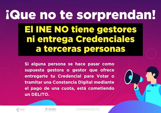 El INE pide a la ciudadanía no dejarse sorprender por personas que pretenden “agilizar” y/o “cobrar” por la expedición de la Credencial para Votar o la Constancia Digital; asimismo solicita su participación, a través de la denuncia de estas actividades a INETEL: 800 433 2000.