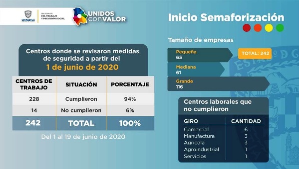 Como parte de las acciones realizadas la semana del 15 al 19 de junio, ante el cambio de semáforo a color naranja en la región Chihuahua, la titular de la STPS, detalló que se realizaron 57 visitas para vigilar las medidas de seguridad, donde 54 empresas cumplieron y 3 no.