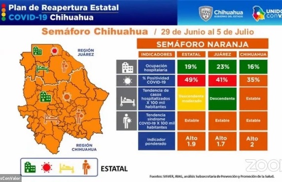 Chihuahua permanecerá en semáforo naranja durante la próxima semana, del 29 de junio al 5 de julio, pese al porcentaje de positividad que se registra, ya que los cuatro indicadores del sistema de semaforización son estables, informó la subsecretaria de Medicina Preventiva y Promoción de la Salud, Mirna Beltrán Arzaga.