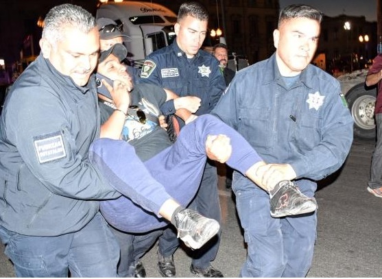 Poco antes de las 19:00 horas comenzaron a arribar las unidades de la Policía Vial; ahí comenzó la trifulca donde comenzaron a detener a quienes encabezan la protesta.