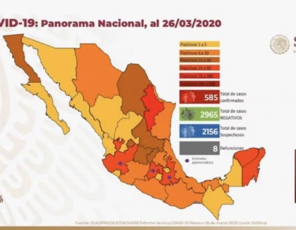 Autoridades de la Secretaría de Salud federal (Ssa) informaron en conferencia de prensa que el número de casos confirmados de la nueva cepa de coronavirus Covid-19 aumentó a 585 en México.