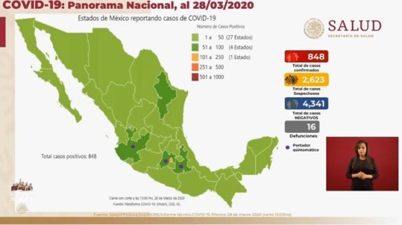 La Secretaría de Salud confirmó que suman 848 casos de infectados con el coronavirus Covid-19 en todo el país y 16 muertes.