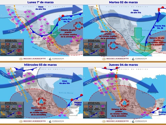 Las condiciones anteriores serán generadas por el Frente Frío Número 39, que recorrerá el norte y noreste de México, así como por un canal de baja presión que se extenderá sobre el oriente del territorio nacional. Se pronostican temperaturas mínimas de -10 a 5 grados Celsius con heladas en zonas montañosas de Chihuahua y Durango; de -5 a 0 grados Celsius con heladas en regiones altas de Baja California y Sonora