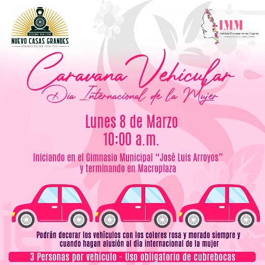 En el marco del Día Internacional de la Mujer este próximo día 8 de marzo, el Gobierno Municipal de Nuevo Casas Grandes a través del Instituto Municipal de las Mujeres convoca a quienes deseen participar en una “caravana vehicular”, para que acudan este lunes a las 10:00 de la mañana al gimnasio Municipal ubicado en la avenida Juárez, a fin de conmemorar esta fecha.