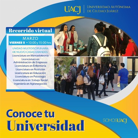 La UACJ invita a los alumnos próximos a egresar de preparatoria a conocer la oferta académica de su División Multidisciplinaria en Nuevo Casas Grandes en el evento virtual "Conoce tu Universidad", el cual se realizará el próximo viernes 5 de marzo a través de la plataforma Teams, a las 10:00 y a las 15:00 horas.